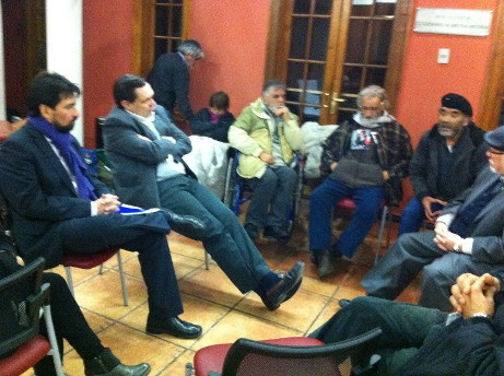 (Photos: in the cage hunger strikers. In the other picture, the man in the grey suit on the left is Pablo Velozo, Secretary General of the Socialist Party, who promised the strikers they would not be evicted yet ordered the anti-riot police to forcefully remove our friends in less than 24 hours - notice the difference in gestures and the disdain of these bureaucrats in reference to the elderly hunger strikers, former political prisoners under Pinochet. Finally, the police getting ready to enter the building of the Socialist party to remove our brothers and sisters. The picture of a smiley President Bachelet, who has not even acknowledge the existence of hunger strikes says "Socialist Party... we are with you".)